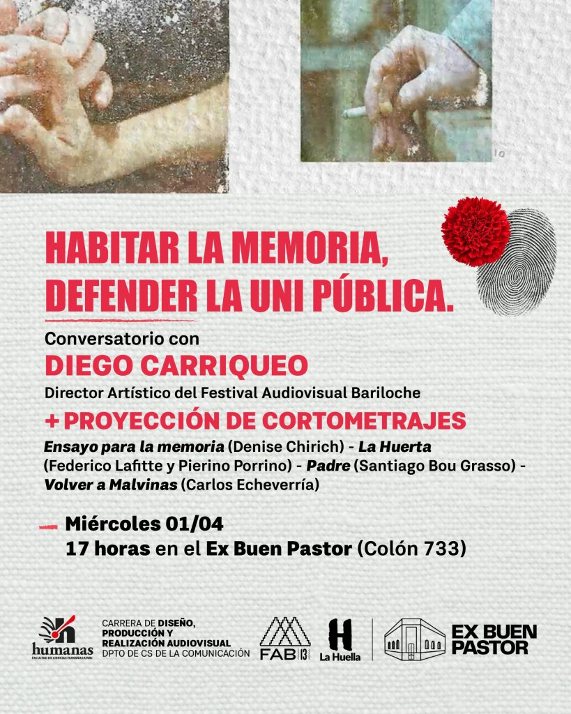 La actividad contará con la participación de Diego Carriqueo, director artístico del Festival Audiovisual Bariloche, quien brindará una charla abierta, seguida de la proyección de una selección de cortometrajes que abordan distintas perspectivas sobre la memoria, la identidad y la historia reciente.