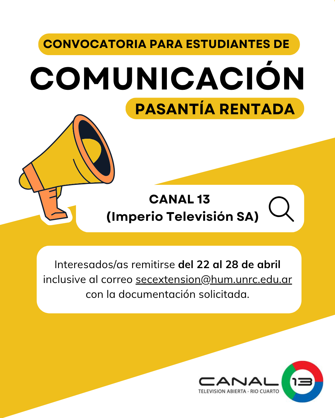 Canal 13 (Imperio Televisión SA) solicita dos (2) pasantes para desempeñar tareas de redacción de notas periodísticas; revisión y adaptación de materiales para su difusión en plataformas digitales del canal; participación en el diseño de estrategias digitales orientadas a ampliar el alcance y la interacción con las audiencias; colaboración en tareas de videograph, producción y asistencia en piso durante los programas emitidos por la señal; participación en coberturas en exteriores, incluyendo eventos puntuales, entrevistas y producciones periodísticas fuera del estudio; producción de contenidos para nuevo programa de corte informativo.