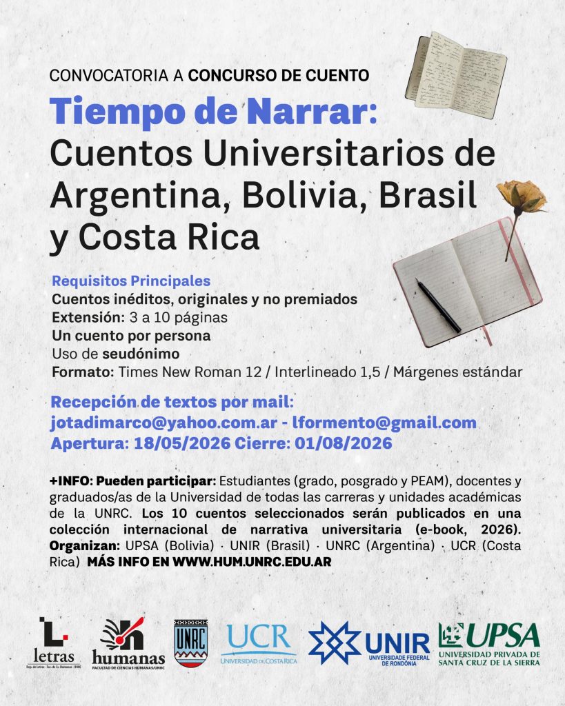 Se convoca a participar de la selección de cuentos “Tiempo de Narrar: Cuentos Universitarios de Argentina, Bolivia, Brasil y Costa Rica”, una colección que reunirá cuarenta cuentos. El primer volumen se publicará en 2026 y se proyecta la publicación de al menos cuatro volúmenes hasta 2029. El resultado será una producción bilingüe, sin traducciones, que se espera logre iniciar una tradición.