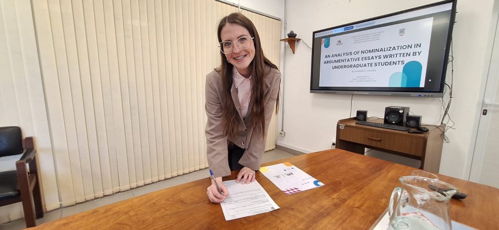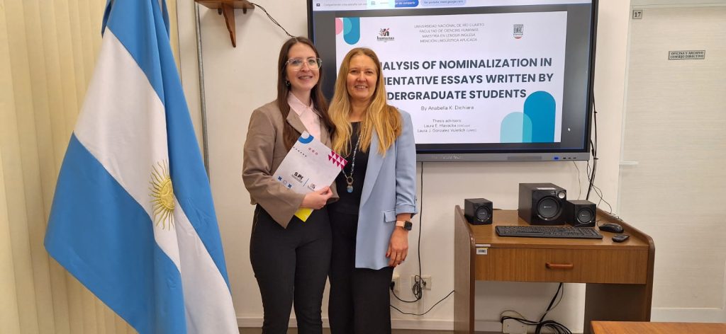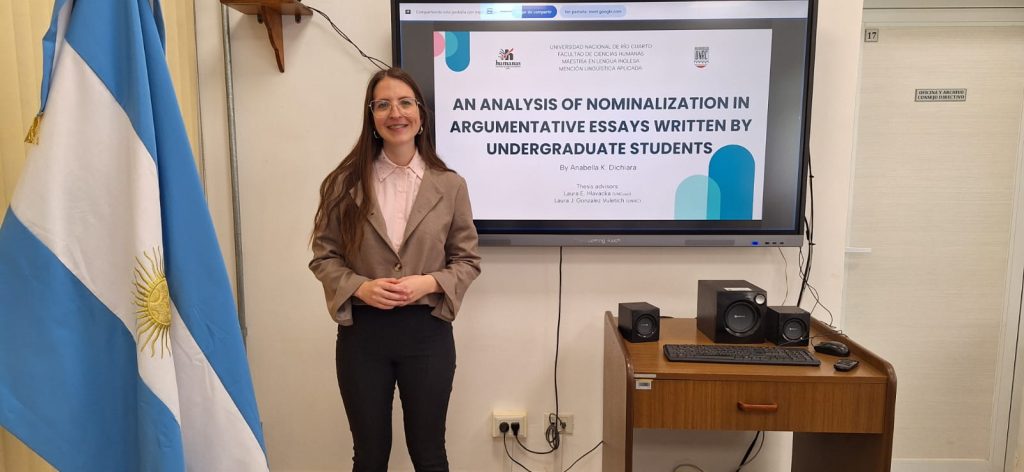 Anabella Dichiara defendió su trabajo titulado «Análisis del uso de la nominalización en ensayos argumentativos de estudiantes universitarios” y se convirtó en nueva Magíster en Lengua Inglesa, mención Lingüística Aplicada de la Facultad de Ciencas Humanas. La tesis fue dirigida por la Mgter. Laura Hlavacka (Universidad Nacional de Cuyo) y codirigido por Mgter. Laura Gonzalez Vuletich (Universidad Nacional de Río Cuarto)
